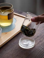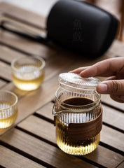 Experience the convenience and elegance of tea on the go with the Kaori Portable Glass Tea Set. This Japanese-inspired set features a combination of a portable glass cup and a fair cup with a built-in filter. Perfect for those who appreciate the art of Gong Fu Cha wherever they go.